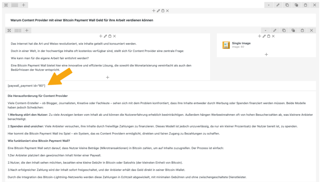Include Coinsnap Bitcoin Paywall Shortcode in Content